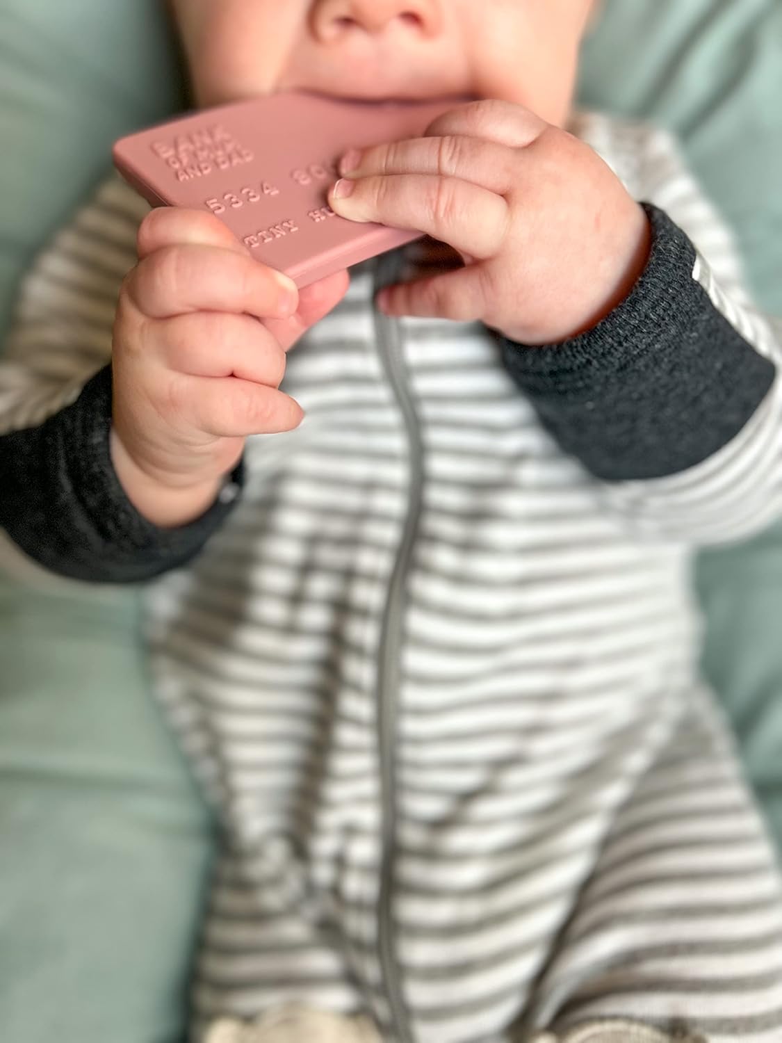 Introducing the Baby Teether Credit Card – the cutest solution to your baby's teething woes! Designed to look like a credit card, this teether is a fun and unique way to soothe your little one's gums. Made from 100%-Safe non-toxic Food Grade Silicone, our teether is gentle on your baby's sensitive gums and is free from BPA, phthalates, and other harmful chemicals. The textured surface provides a satisfying chew for your baby, helping to alleviate the discomfort of teething This teether is also easy to clean, making it a practical choice for busy parents. Simply wash it with warm soapy water or wipe with a clean damp cloth. Our Baby Teether Credit Card is designed for babies aged 3 months and older, making it a perfect choice for any teething baby. Whether you're at home or on the go, this teether is a great way to keep your baby happy and entertained. The toy teether is soft and comfortable to grasp and hold. It is the perfect shape to help your baby develop their fine motor skills. In addition to being a great teething aid, our Baby Teether Credit Card also encourages sensory exploration and helps to develop hand-eye coordination. Your baby will love exploring the textures and colors of this unique teether.